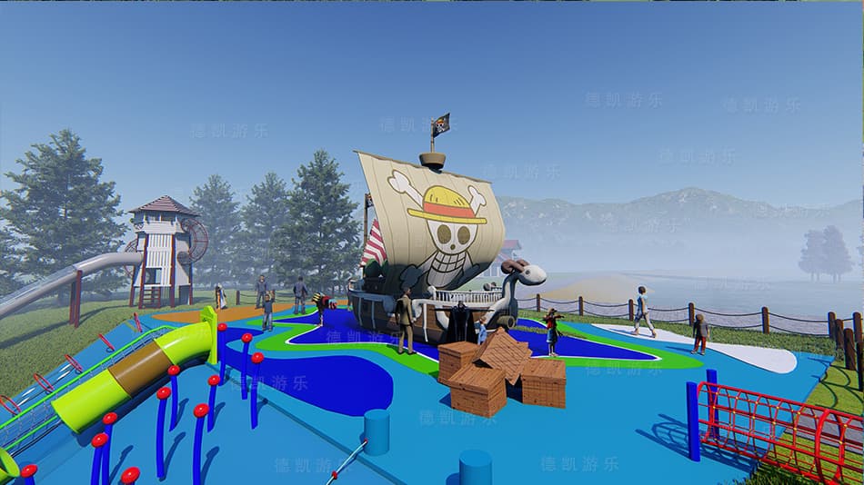 主要顯示海盜船和裝寶藏的箱子的細節(jié),間接顯示斜坡的傾斜度,斜坡上設備的細節(jié),還有遠處草坪上充滿探險滑梯。